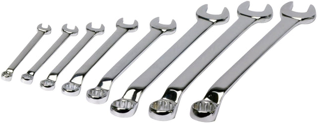 8-delig, (BS6012) Voordelen van het wigprofiel: - Toepasbare en veilige grip, zelfs met tot 30 % afgeronde of beschadigde schroeven en moeren - Goede krachtoverbrenging en betere drukverdeling door groter contactoppervlak - Het vermijden van schade aan de schroefkop De set bestaat uit de volgende ring-steeksleutels: 1x 6 mm, 95 mm lang 1x 8 mm, 105 mm lang 1x 10 mm, 125 mm lang 1x 12 mm, 155 mm lang 1x 13 mm, 165 mm lang 1x 14 mm, 180 mm lang 1x 17 mm, 215 mm lang 1x 19 mm, 240 mm lang Lange schacht, ringzijde om 70° gebogen 12-kant, metrisch. Met innovatief wigprofiel, hoogglans verchroomd, chroom-vanadium. Incl. gereedschapshouder voor wandmontage Bestaande uit: SW 6 - 8 - 10 - 12 - 13 - 14 - 17 - 19 mm
