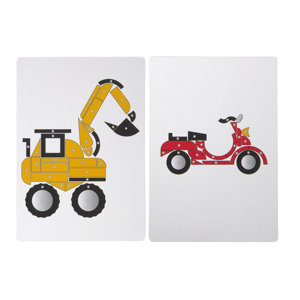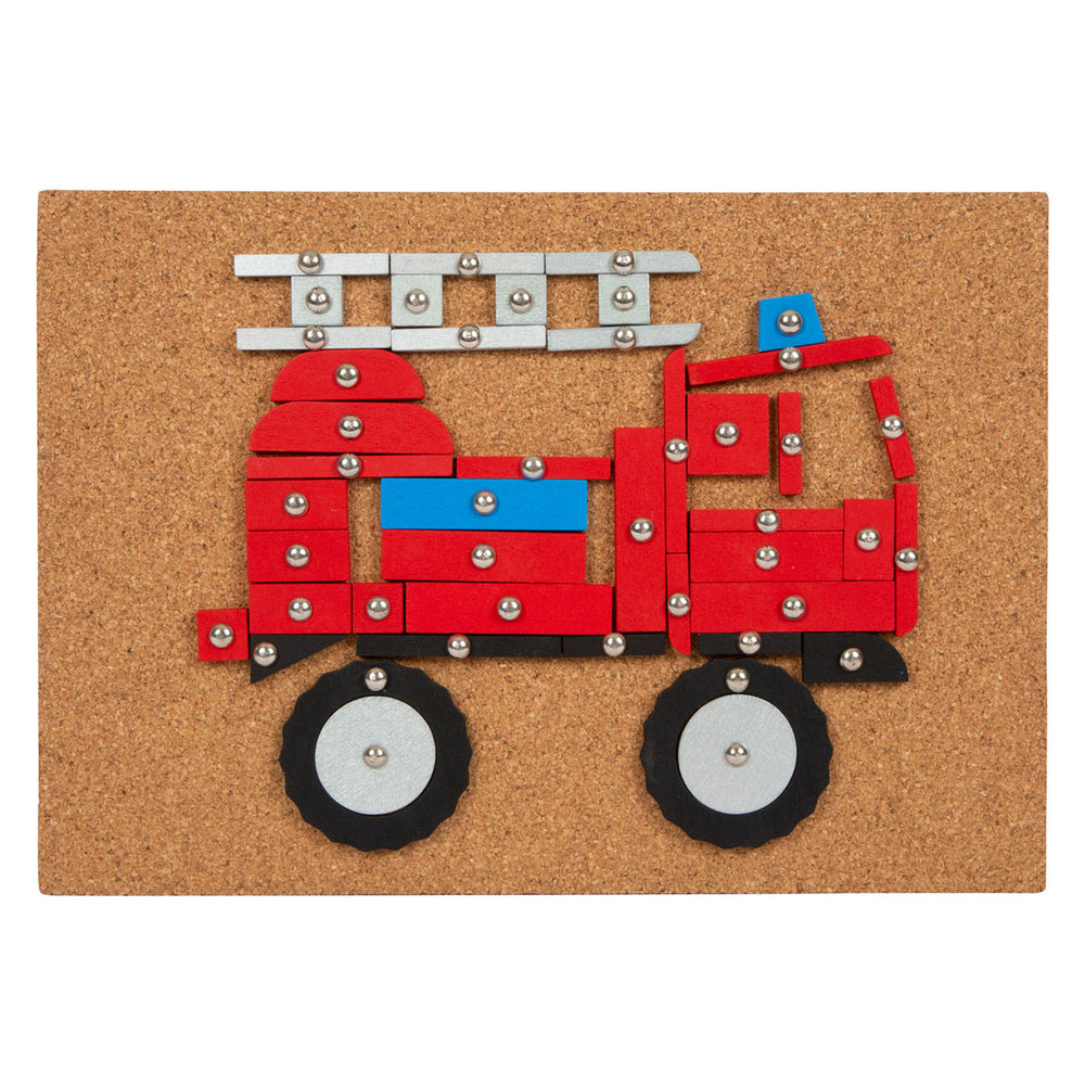 Обширна творческа игра, поставена в темата за мобилността, превозните средства и сцените от градска среда! В комплект с дъска за корк, дървен чук, нокти и много различни дървени елементи от ламинирано дърво можете да направите безброй изображения и мотиви с тази игра с чук.