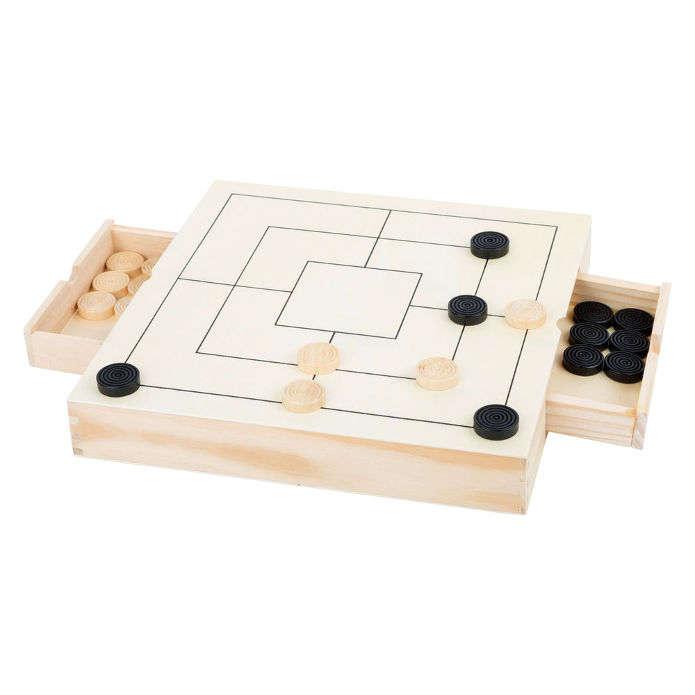 With this game set, players can showcase their skills at the board games of checkers, Nine Men's Morris, and chess. The pieces can be safely stored in drawers beneath the boards, ensuring safe transport. With these classic games combined in one set, fun is guaranteed!