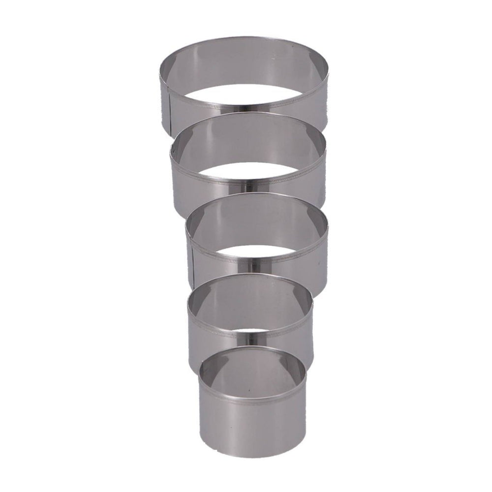 A set of 5 round protection shapes for baking. Diameters: 4, 5, 6, 7 and 8 cm. Material: stainless steel. Color: Silver.