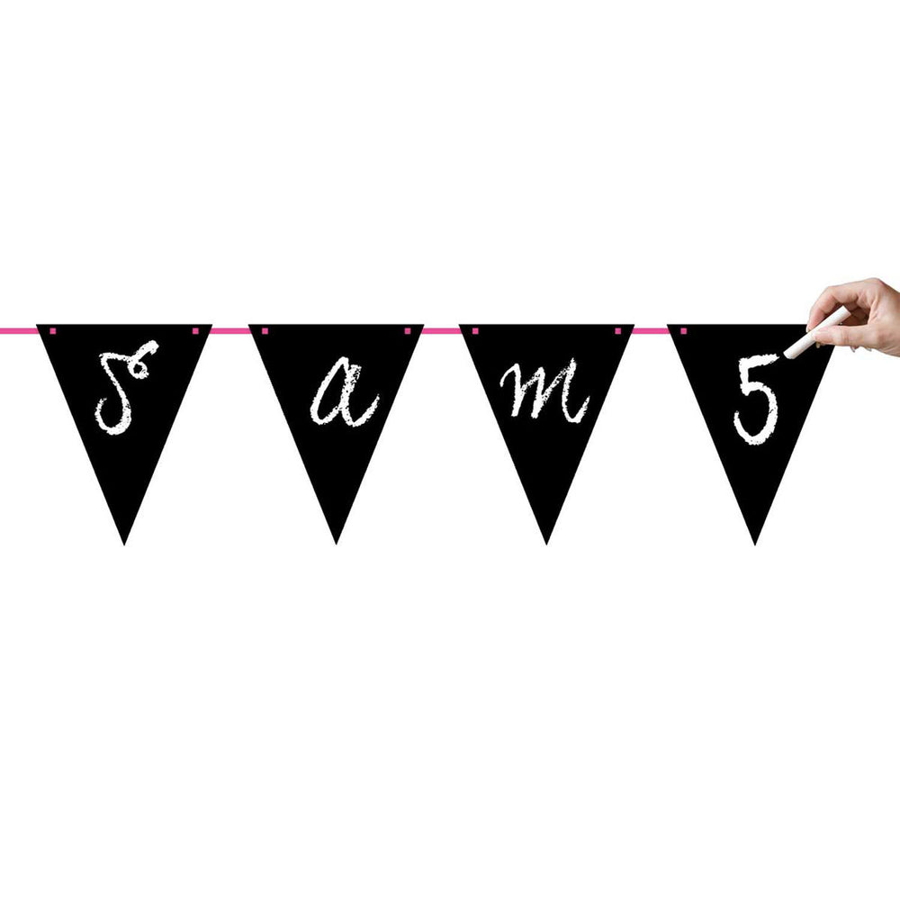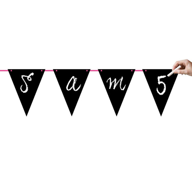 Направете партито си лично с тази овесарка с възможност за писане! Флаг линията е с дължина 6 метра и се състои от 10 знамена с размери 21 см х 27 см. Напишете името на рожденика, възрастта или нещо друго забавно върху знамената. Тебеширът е включен, така че можете да започнете веднага!
