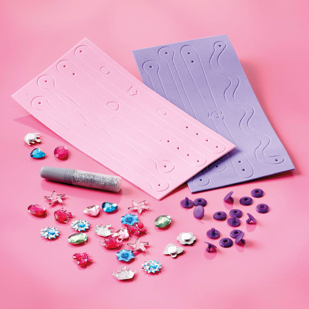 Украсете вашите собствени гривни. Направете свои собствени уникални гривни с този комплект. Includes 8 foam bracelets, 25 self-adhesive rhinestone figures, 8 closing clips, glitter glue and instructions for use.