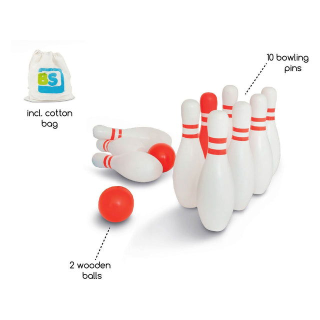 BS toys wooden bowling set, 12 pieces. Raigned and is sent as soon as it is back in stock.
