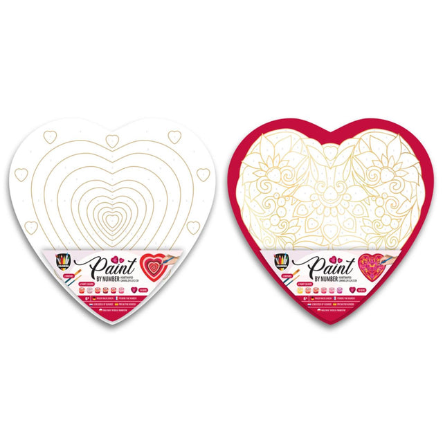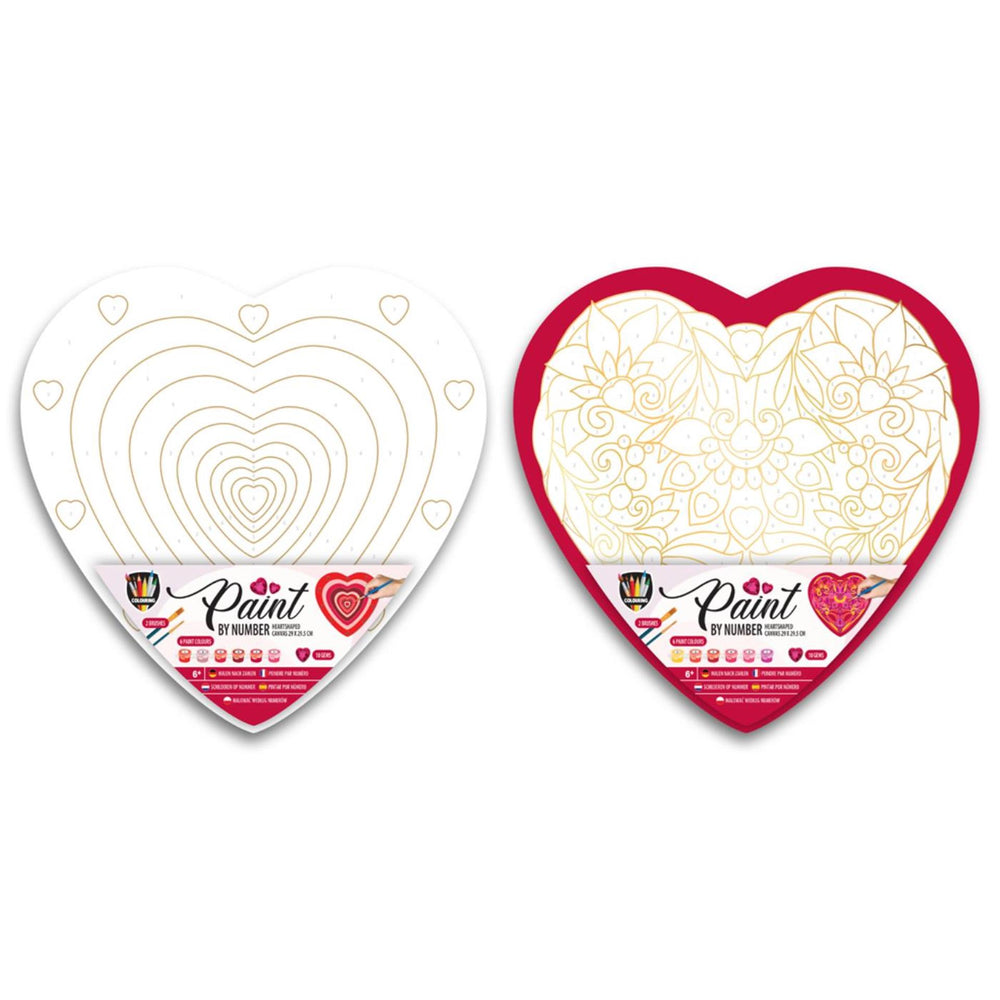 Paint by Number canvas in the shape of a heart, including 2 brushes and 6 pots of paint. The canvas has gold foil details and numbering for the matching colours. Suitable from 6 years.