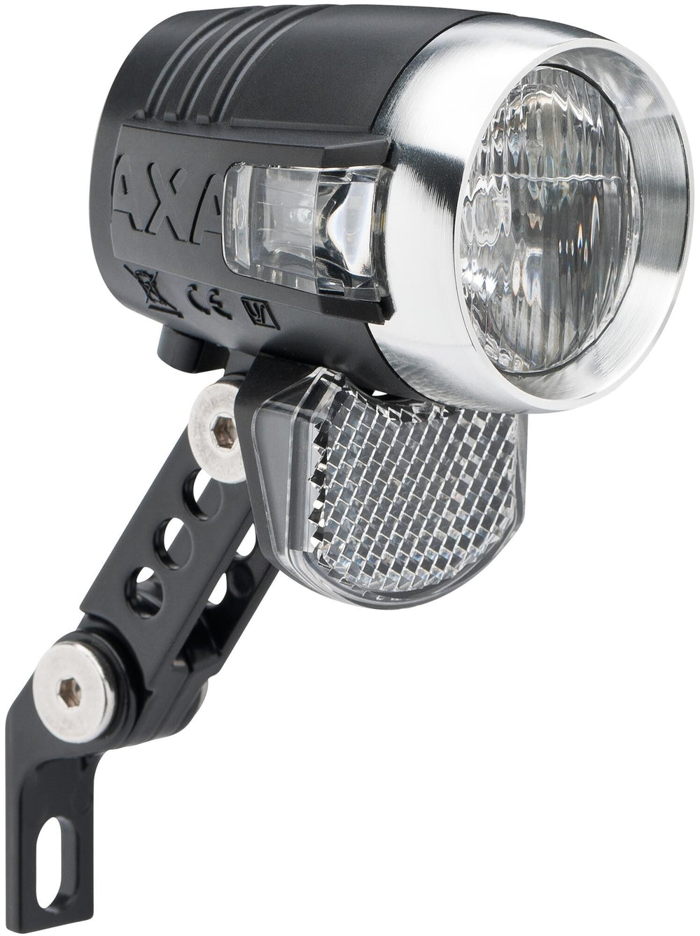 Headlamp head, the crown, specifically suited for e-bikes with a 50-lux lamp and 6V. The Blueline50 is a small, compact dynamo headlamp with a very high light output of no less than 50 lux. The Blueline50 offers an integrated retroreflector and optimal light distribution. Both features are specifically designed to increase your safety by making you more visible to oncoming traffic and giving you a clear view of the road ahead. The robust 2-axle steel bracket is suitable for any road type, allows you to position your lamp in any desired position, and can also be replaced with a bracket for semi-integration with most common front forks. This version is specifically designed for connection to a 6V e-bike battery. LIGHT BEAM: 70 meters "see," 4000 meters "be seen."