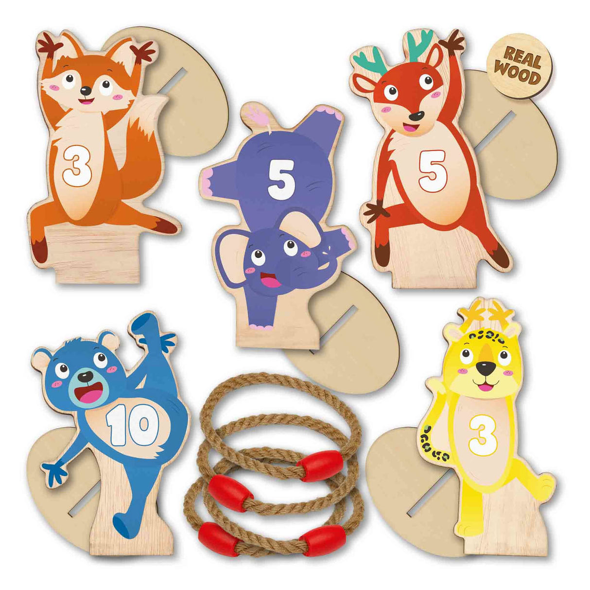 Let's toss! These 5 cheerful animals can be set up in any configuration you like. This way, children can enjoy endless fun tossing the rings outdoors. Try to throw the rings around as many animals as possible and see who comes home with the winnings! Features • Real wooden parts • Sturdy rope rings • 5 different cheerful animals • Made of sturdy materials for outdoor use Contents: 5 Wooden ring toss animal figures, 5 Wooden ring toss holders, 4 Rope rings. Suitable for ages 3 and up.