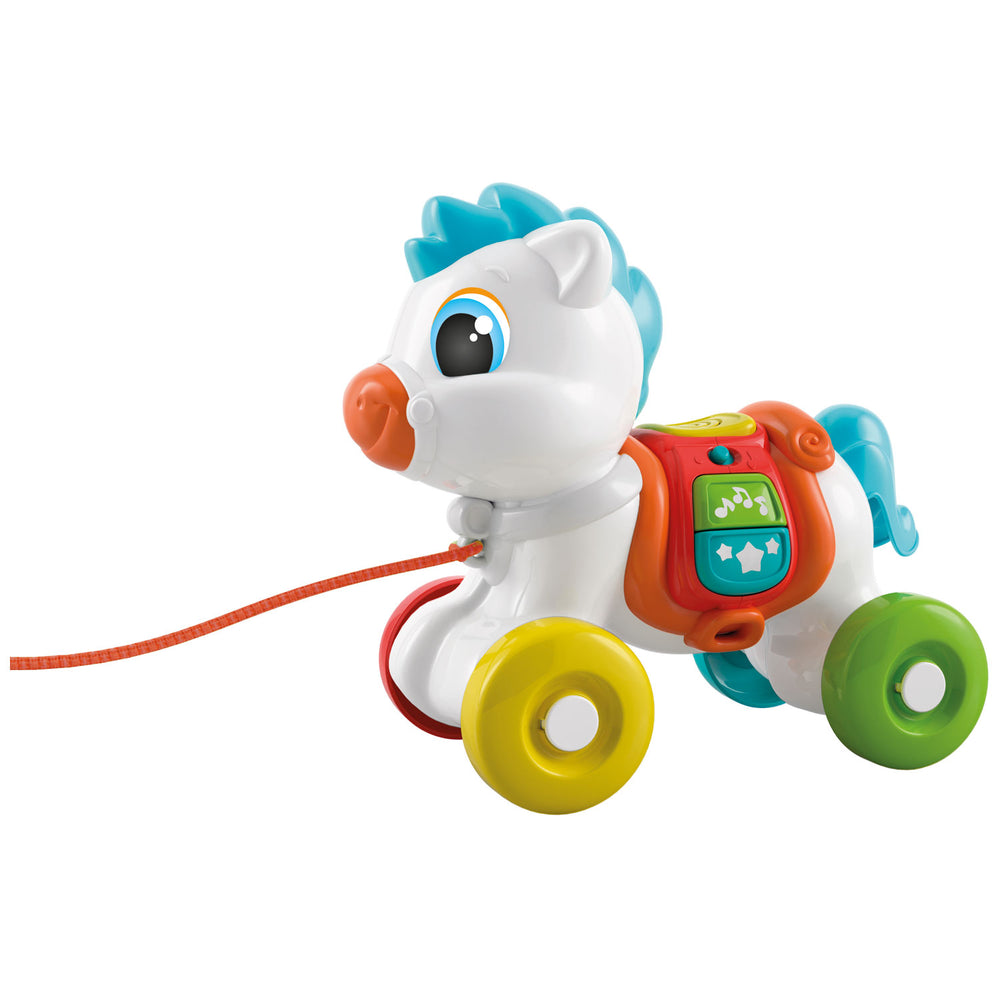 Velmi sladký smutkový poník, který si s sebou vždy vezme. Stisknutím klíčů jeho sedla ožívá poník. Díky zvukovým efektům jí, směje se a pobaví dítě. Díky interaktivním klávesám, kolům a laně podporuje poník senzorický a motorový vývoj. Kultovní charakter linie dětského Clementoni, který děti hodně milují. Vyrobeno v Itálii.