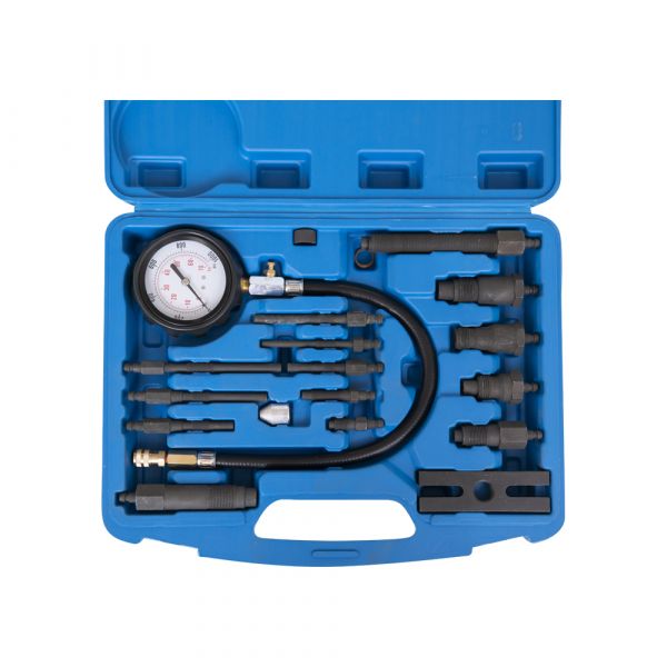 Tato kompletní 17dílná testovací sada pro kompresi dieselových motorů je vhodná pro téměř všechny značky automobilů, jako jsou BMW, Mercedes, Ford, VW, Toyota, Renault, Volvo, Mazda, Citroën, Opel, Nissan a Peugeot. Sada obsahuje adaptéry pro žhavé zátky a figuríny pro různé typy automobilů.