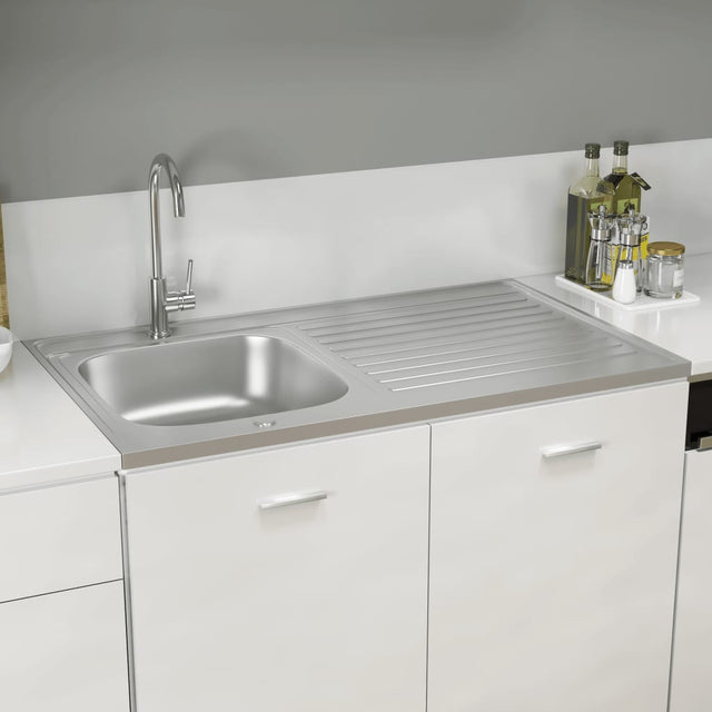 Umyvadlo je vyrobeno z SUS (nerezové oceli), díky čemuž je tepelně odolný a odolný proti poškrábání a také se snadno čistí. Tento umyvadlo má extra silné strany, aby položila skříň na vrchol a vypouštěcí deska vám dává další prostor pro vaše jídla. Má také vypouštěcí trubku, se kterou může být připojen k děrům jeřábů na obou stranách. Protože dřez je zcela reverzibilní, může být namontován s dřezem vlevo nebo napravo.