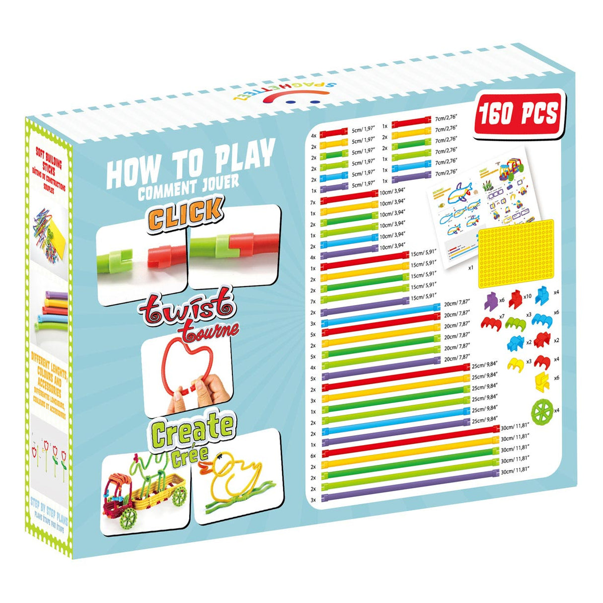 Spaghettez ist die ideale Mischung aus Kunsthandwerk und Bauen für Kinder, die Kreativität lieben. Mit diesen weichen, flexiblen Stangen können sie endlos schöne Kreationen herstellen. Klicken, drehen und erstellen! Von einem großen Haus bis zu Blumen, Lastwagen und sogar einem Wal sind die Möglichkeiten endlos. Dieses Set enthält 160 Stücke und ist für Kinder ab 4 Jahren geeignet.