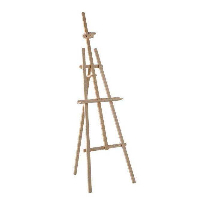 Stabile Dreibein-Studiostaffelei aus Kiefernholz. Der Tuchträger ist für eine optimale Arbeitshöhe höhenverstellbar und mit einer Tuchklemme für eine gute Stabilität des Tuches ausgestattet. Auch für 3D-Keilrahmen geeignet. Leicht faltbar.