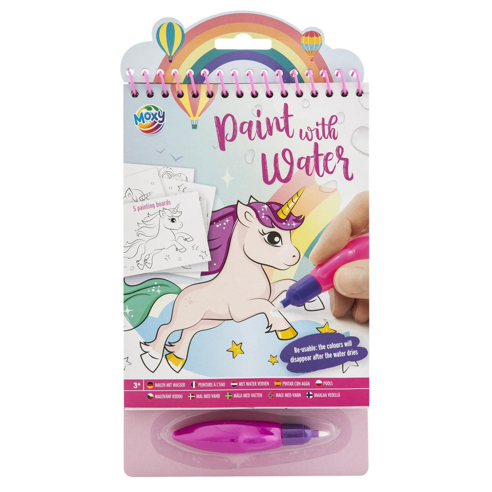 Unicorn-themed coloring book. Includes a water pen and 5 coloring pages. Suitable for children ages 3 and up.