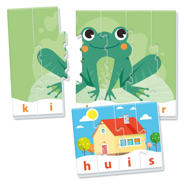 Juego de rompecabezas con 16 rompecabezas para aprender a reconocer y deletrear las primeras palabras y letras.
