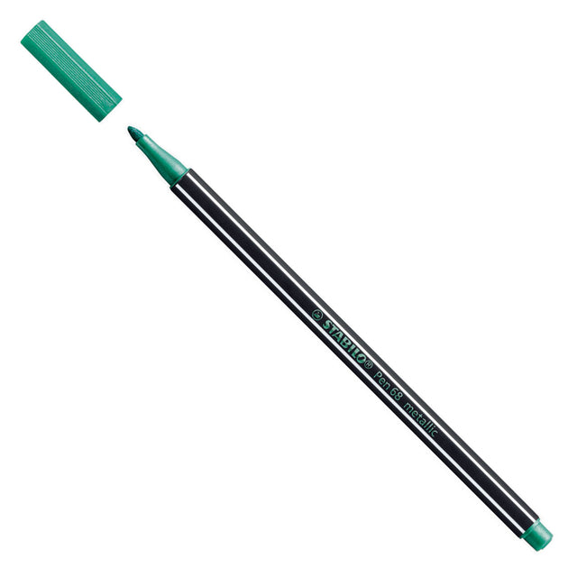 El STABILO FIENTE -TIP PEN METALLIC GREEN (68/836) es perfecto para hacer líneas y grandes superficies. El marcador tiene un punto redondo robusto y resistente a la presión con un ancho de escritura de aproximadamente 1,4 mm. Lo que hace que esta pluma de fieltro es única es que puede permanecer sin una tapa por hasta 24 horas sin secarse.