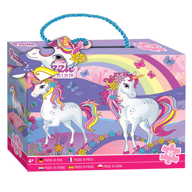 Caja con rompecabezas de unicornio que consta de 45 piezas. El rompecabezas tiene un tamaño de 39 x 29 centímetros. Adecuado para niños de 4 años.