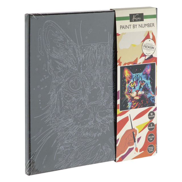 Pintura por número: gato en lienzo negro. El tamaño es de 30x30 cm. El kit de pintura contiene 18 colores y 3 cepillos.
