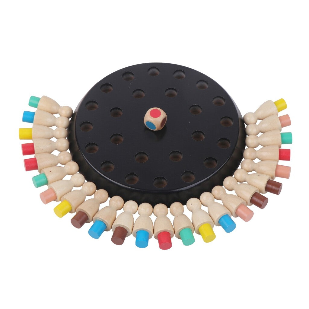 Coloque todos los peones al azar en el plato de madera y recuerde qué color tienen. Enrolle con los dados e intente agarrar el peón con el color que gira del plato. Si tomas el peón correcto, ¡este es tuyo y puedes seguir jugando! El jugador con la mayor cantidad de peones gana. Contenido: tablero de juego, 24 peones de colores y un dados con superficies de color. Junta de diámetro: 18 cm. Adecuado para 2 jugadores de 5 años.