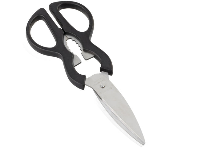 Tijeras estables y universales de la calidad Leifheit. Las afiladas hojas de acero inoxidable no se desafilan incluso después de un uso frecuente. Los mangos ergonómicos son agradablemente estables en la mano y ofrecen numerosas funciones: desde abrir tuercas hasta abrir tapones de rosca y tapas de botellas, todo funciona sin problemas.