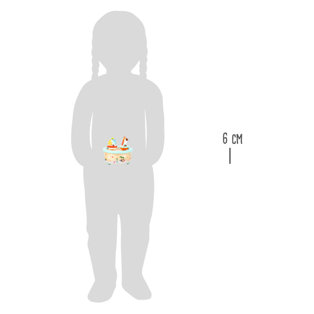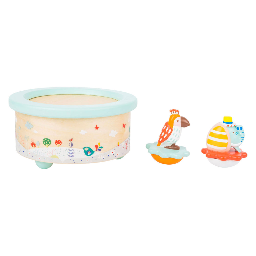 Caja de música de madera de pie pequeño loro y elefante