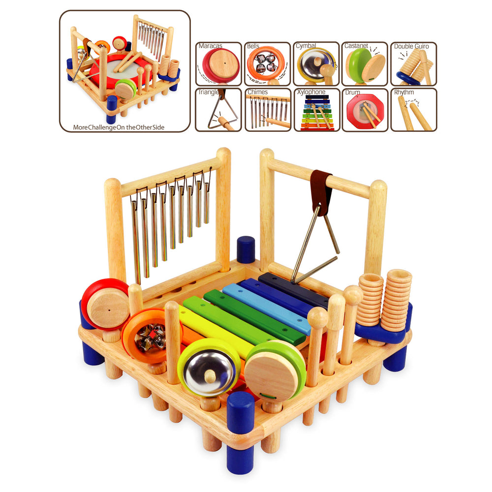 ¡Descubre la magia de la música con este versátil centro de música! Con nuevos desafíos y diferentes instrumentos en cada lado del bloque, este conjunto estimulará su curiosidad y ayudará a desarrollar su sentido de ritmo y sonido. Con no menos de 10 instrumentos diferentes, incluidos Maracas, Call Ratch, Cimbal, Castagnets, Double Guiro, Triangel, Chimes, Xylophone, Drum and Rhythm Stick, aprendes a lidiar con diferentes sonidos y ritmos de una manera juguetona. ¡Disfruta de horas de música y tocando el placer con este gran centro de música!