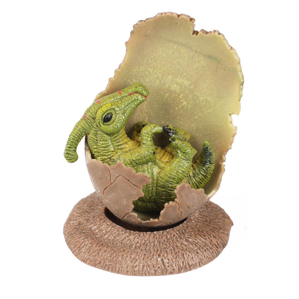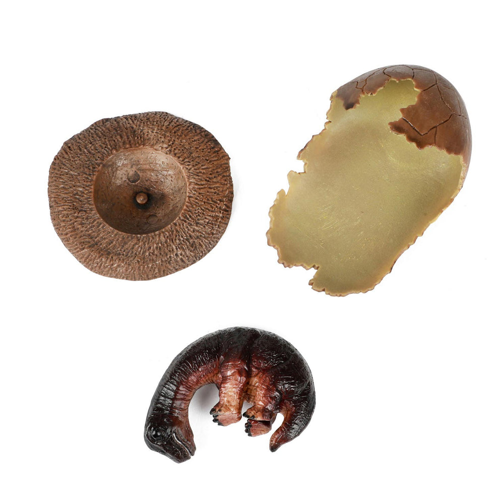 Un bebé de bebé muy detallado que se encuentra en los restos de un huevo. El pedestal debajo del huevo se asegura de que pueda dejarlo para admirar el mundo de los dinosaurios establecidos infinitamente. El pequeño dinosaurio se puede quitar y volver a colocar de una manera que más le guste.
