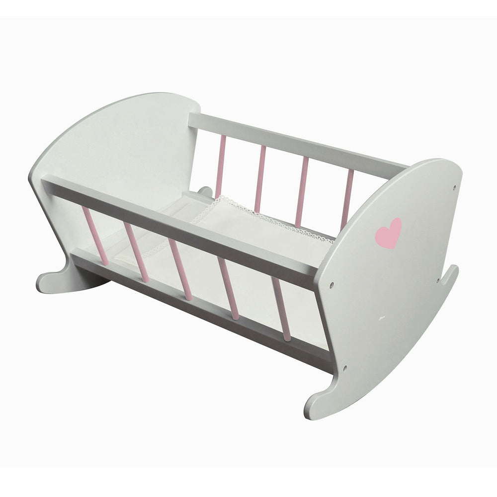 A beautiful wooden bed with pink bars and a painted heart on the head and foot end. This bed comes with a blanket, pillow and mattress.