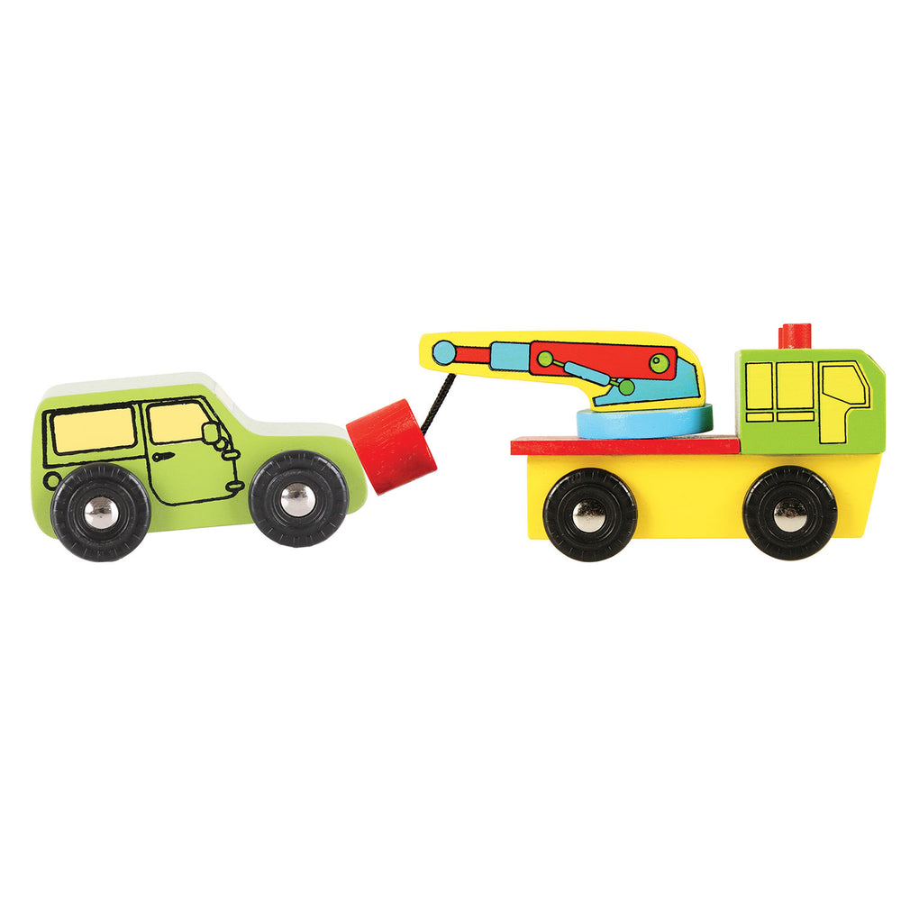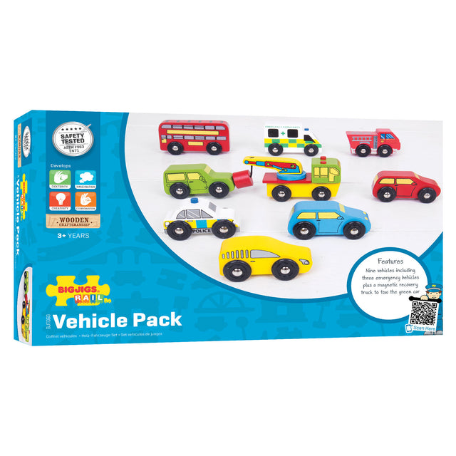 Avec ces 9 véhicules en bois, vous vivrez les meilleures aventures! Vous avez 9 types de voitures différents. Vous avez un camion de pompiers, une voiture de police, une ambulance, un bus, une dépanneuse et 4 voitures de personnes. Avec cet ensemble complet, vous pouvez varier pendant des heures dans votre jeu. La dépanneuse peut vraiment faire glisser la voiture verte avec l'aimant. Convient aux routes de BigJigs bien connues.