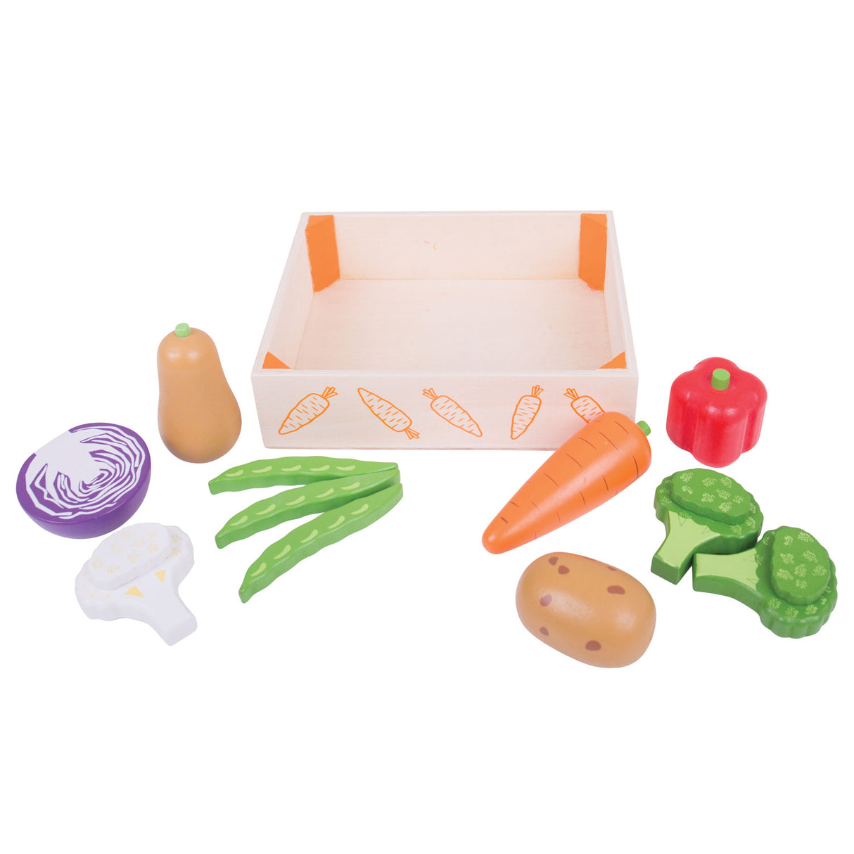 - Contient des figures en bois en chou-fleur, brocolli, haricots, chou, pomme de terre, poivron et carotte