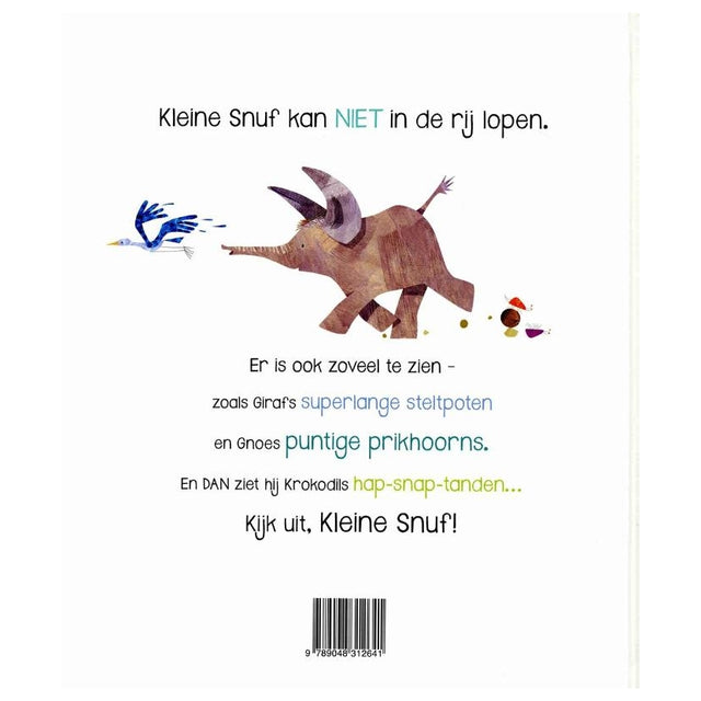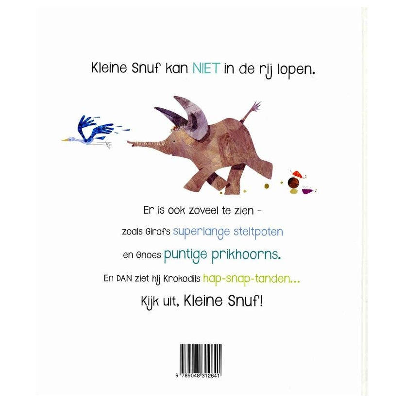 Kleine Snuf kan niet in de rij lopen. Er is ook zoveel te zien - zoals Girafs superlange steltpoten en Gnoes puntige prikhoorns. En DAN ziet hij Krokodils hap-snap-tanden... Kijk uit, Kleine Snuf!