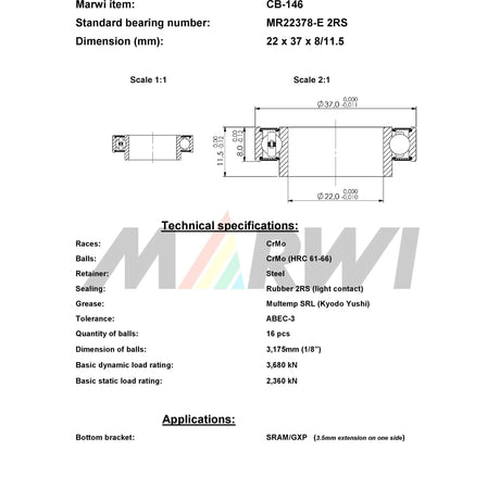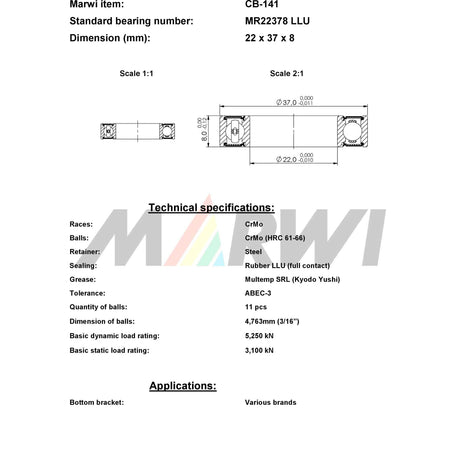 Marwi Union Kogellager CB-141 MR22378 2RS 22X37X8