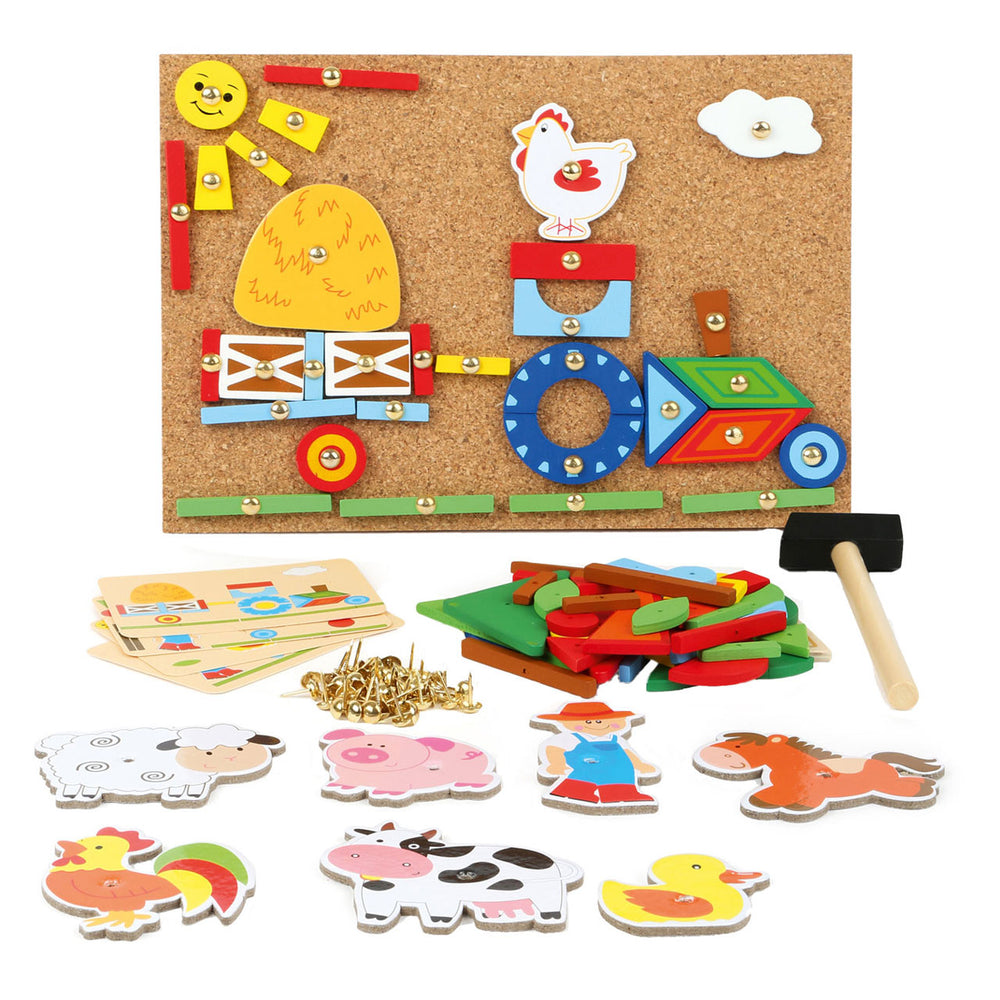 Avec ce jeu de marteau, les enfants peuvent s'amuser de manière amusante et créative! Le jeu contient divers miroirs agricoles qui peuvent être martelés sur une planche de liège. Il y a quatre cartes avec des suggestions d'images. Le jeu Hammer est fourni dans une boîte pratique et peut facilement être stocké.