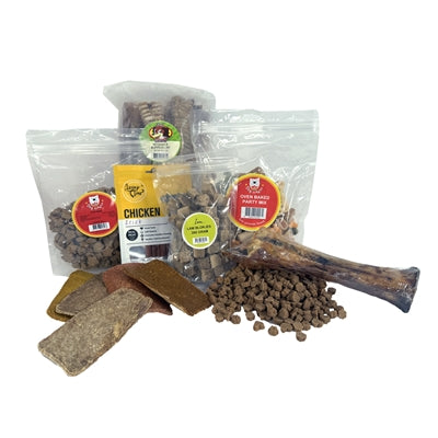 Le forfait de Noël de la fête de Fred est généreusement rempli de toutes sortes de collations de chien savoureuses, pour chouchouter votre chien à Noël.
