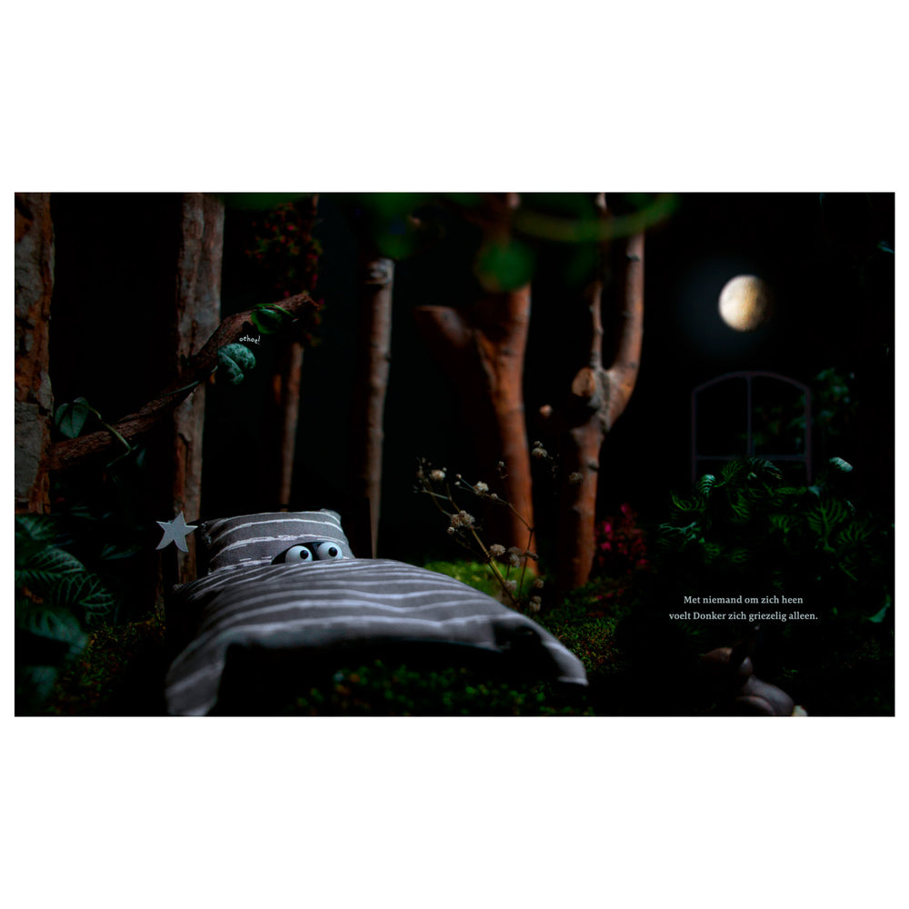Pictiúrleabhar álainn lán le figiúirí agus cúlraí lámhdhéanta leis an scannánóir óg Marit Kok (1996). Bíonn eagla ar an dorchadas roimh an oíche, ach nuair a fheictear lampa álainn ina sheomra leapa, socraíonn sé é a leanúint ar aon nós. Treoraíonn an solas é anuas ar fhoraoisí meirgeacha, phluais glioscarnach agus teach solais lasrach. Seo mar a fhaigheann Donker amach cé chomh hálainn is atá an oíche!