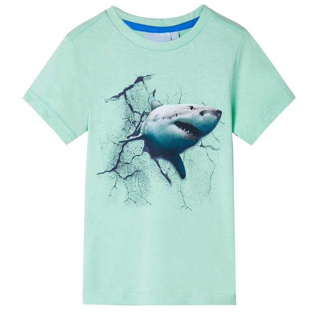 This children's shirt has short sleeves, a round neckline and a straight model. A large shark is shown on this children's shirt. The children's shirt with short sleeves is made of 100% cotton, making it feel soft and comfortable.