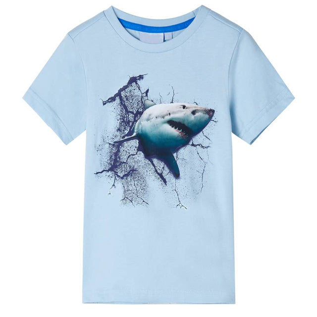 This children's shirt has short sleeves, a round neckline and a straight model. A large shark is shown on this children's shirt. The children's shirt with short sleeves is made of 100% cotton, making it feel soft and comfortable.