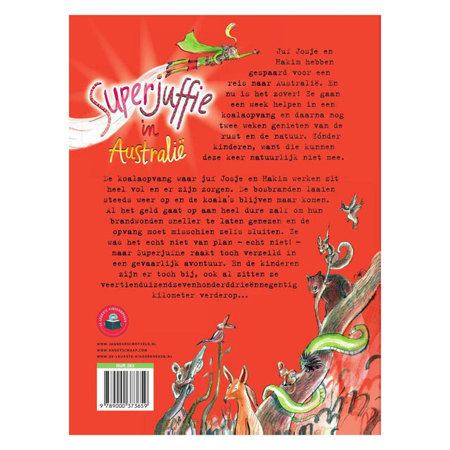 Juf Josje en Hakim hebben gespaard voor een reis naar Australië. En nu is het zover! Ze gaan een week helpen in een koalaopvang en daarna nog twee weken genieten van de rust en de natuur. Zónder kinderen, want die mogen deze keer echt niet mee. De koalaopvang waar juf Josje en Hakim werken zit heel vol en er zijn zorgen. De bosbranden laaien steeds weer op en de koala's blijven maar komen. Al het geld gaat op aan heel dure zalf om hun brandwonden sneller te laten genezen en de opvang moet misschien zelfs sluiten. En hoewel ze het echt niet van plan was -echt niet!- raakt Superjuffie toch verzeild in een gevaarlijk avontuur. En de kinderen zijn er toch bij, ook al zitten ze veertienduizendzevenhonderddrieënnegentig kilometer verderop... Superjuffie in Australië is het negende deel van de populaire serie over de leukste juf van Nederland! Met grappige tekeningen van Annet Schaap. Lees ook uit deze serie: • Superjuffie! • Superjuffie komt in actie • Superjuffie op safari • Superjuffie in de soep • Superjuffie in de jungle • Superjuffie op kamp • Superjuffie op de Zuidpool • Superjuffie en het apencircus • Superjuffie in Australië • Superjuffie in de stormÍocaíocht & Slándáil