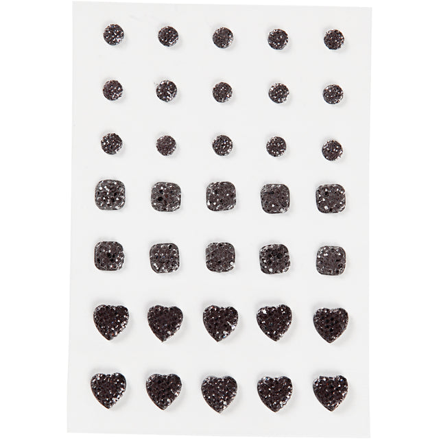 Vivi Gade rhinestones, round, square, heart, size 6+8+10 mm, black, 35 pieces in a box