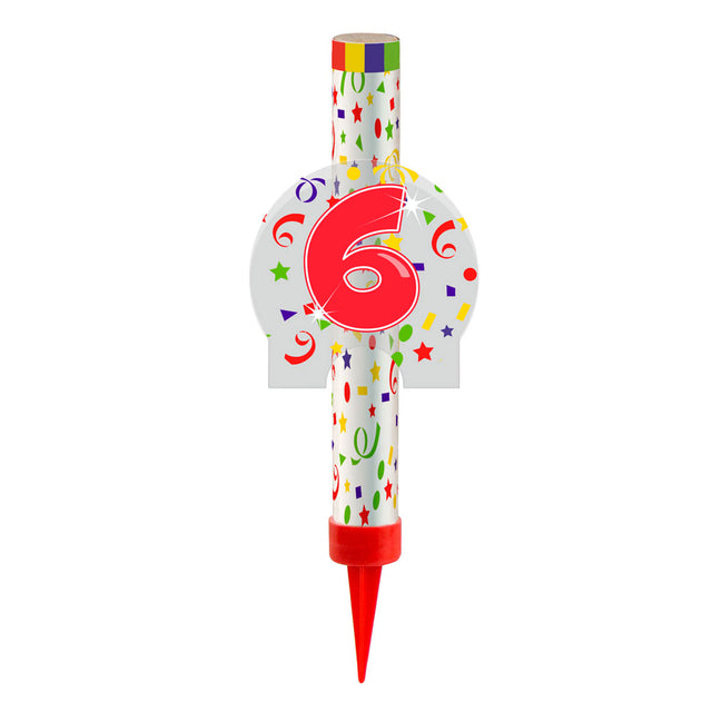 Una fontana di ghiaccio festosa sotto forma del numero 6. Questa fontana di ghiaccio è perfetta per torte e torte di gelato e dà un tocco speciale a ogni celebrazione. Con un tempo in fiamme di circa 45 secondi, questa fontana di ghiaccio offre un'atmosfera spettacolare e festosa. La fontana di ghiaccio è adatta per l'uso interno ed è fornita con una pratica illuminazione.