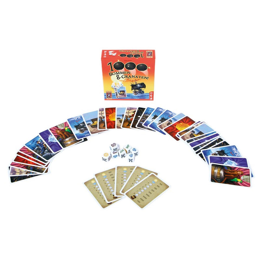 Gioco da dadi con tema pirata. In 1000 bombe e granate! Prova a tagliare il maggior numero possibile di simboli uguali con 8 dadi. Puoi di nuovo azionare le volte tutte le volte che vuoi, ma devi mettere da parte i teschi. Se lanci un terzo cranio, il tuo turno finirà immediatamente e non segnerai punti.