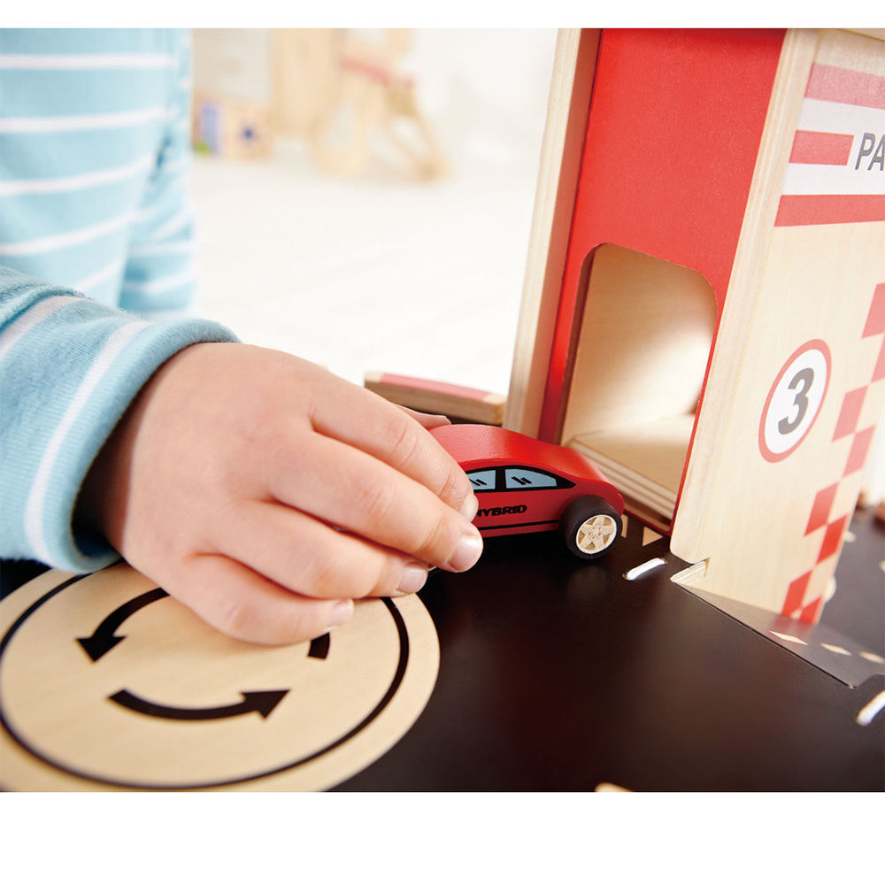 Hape Holz Garage mat 3 Stäck an eng Helikopterplattform.