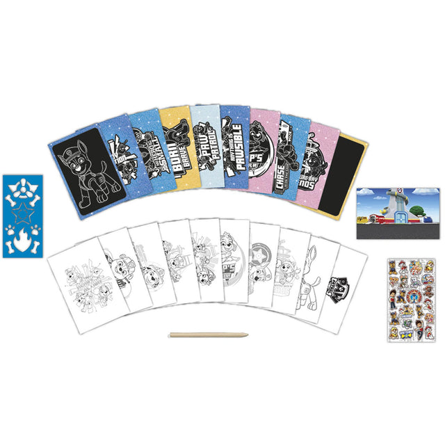Eng flott Aktivitéitsbuch andeems Dir PAW pannrurup mat 10 Scratechkaarten, kraapelen, 11 Faarwen Säiten, e Schabloun an Hannergrond.