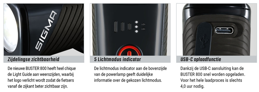 „Buster 800“ yra idealus partneris sudėtingiems vakaro bandymams. Šis priekinis žibintas, kurio šviesos išėjimas yra 800 liumenų ir įspūdingas 170 metrų šviesos pluoštas, siūlo pakankamai galios net tamsiose vietose ir siaurose MTB takuose. „Buster 800“ užima 5 skirtingas pozicijas, įskaitant aukštą, vidutinį, žemą, naktinį mirksėjimą ir dienos mirksėjimą. Priekinis žibintas yra atsparaus (IPX4) spiralės (IPX4) ir jo gaisro trukmė yra mažiausiai 2 valandos aukščiausiu režimu iki 30 valandų žemiausiame režime. Įkrauti integruotą bateriją įmanoma naudojant USB-C įkrovimo funkciją ir netgi įmanoma naudoti. Priekinį žibintą galima lengvai pritvirtinti be įrankių, nes 360 laipsnių reguliuojamas silikono laikiklis. Naudojant spustelėjimo jungiklį su apčiuopiamu įjungimo/išjungimo indikacija, priekinių žibintų veikimas yra labai draugiškas. „Buster 800“ taip pat turi šviesos režimo atminties funkciją, kad priekinis žibintas vėl užsidegtų tuo pačiu režimu ir tuo pačiu profilio sistemos skyriumi, kaip ir išjungus. Akumuliatoriaus būseną rodoma 6 greičių akumuliatoriaus indikatorius, o įkrovimo būseną galima patikrinti naudojant 5 greičių įkrovimo indikatorių. Priekinis žibintas yra aprūpintas „Cree LED“ ir jo svoris yra 150 gramų. Kokybės ženklas nenurodytas.