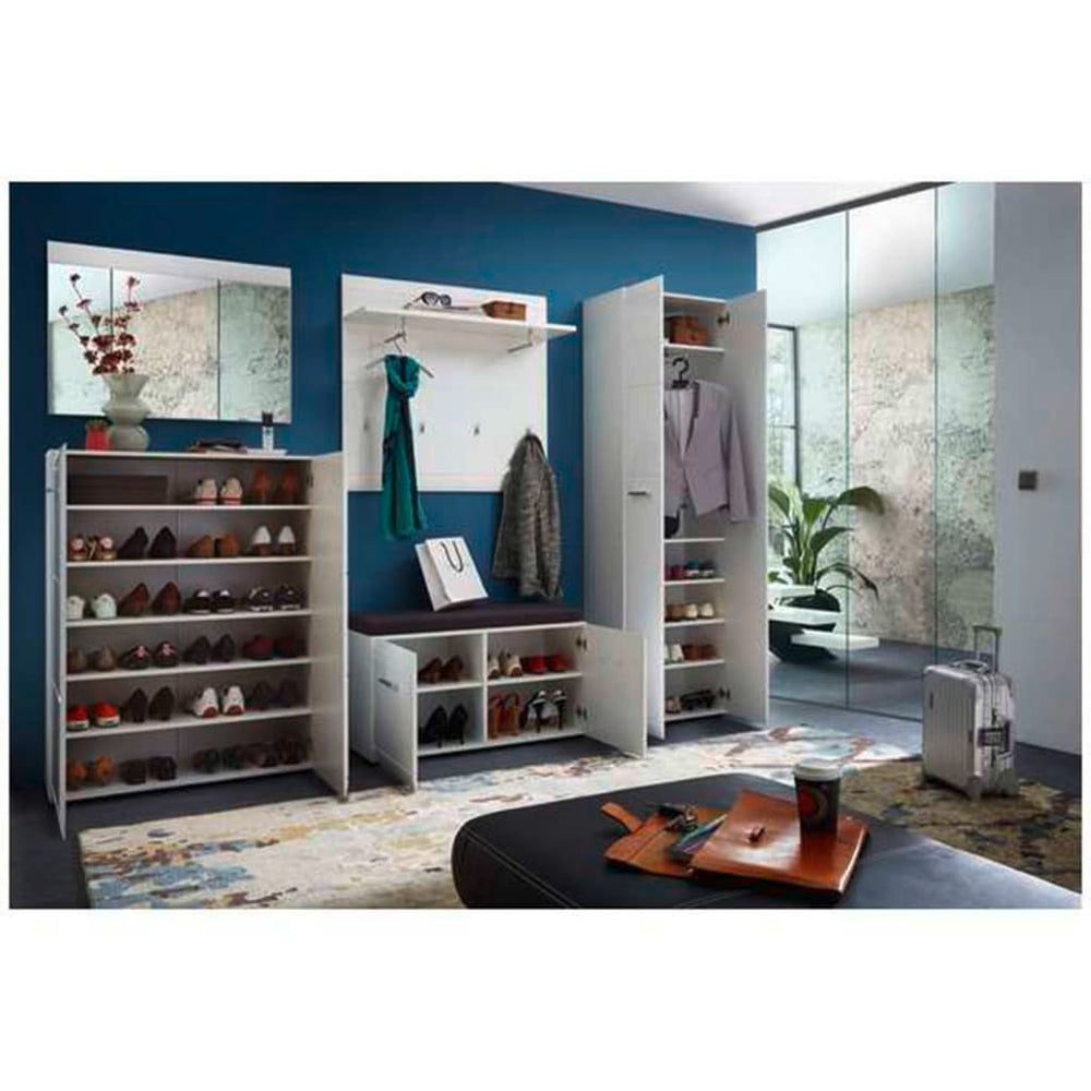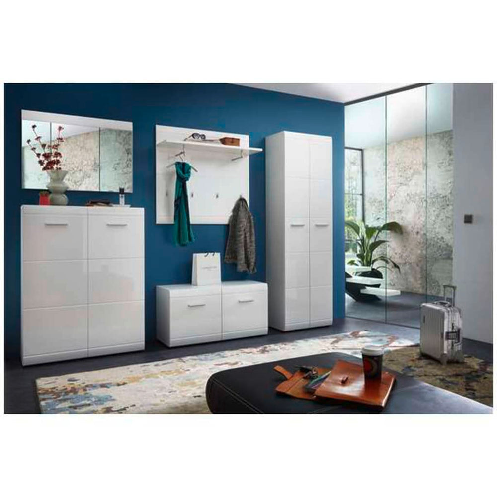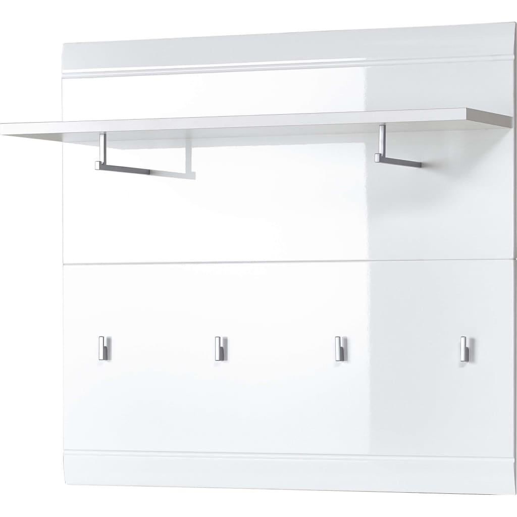 Het ruimtebesparende kapstokpaneel Adana van Germania biedt voldoende opbergruimte om tassen en kleding geordend te houden - zelfs in smalle of kleine gangen. Naast zijn glanzende uiterlijk is het paneel ook een functionele en praktische toevoeging aan je gang. Met het opbergschap, 2 kledingstangen en de 4 kledinghaken creëert dit kapstokpaneel veel opbergruimte voor jassen, vesten, sjaals en hoeden. De witte behuizing en de opvallende fronten met gefreesde groeven creëren een perfect uiterlijk.