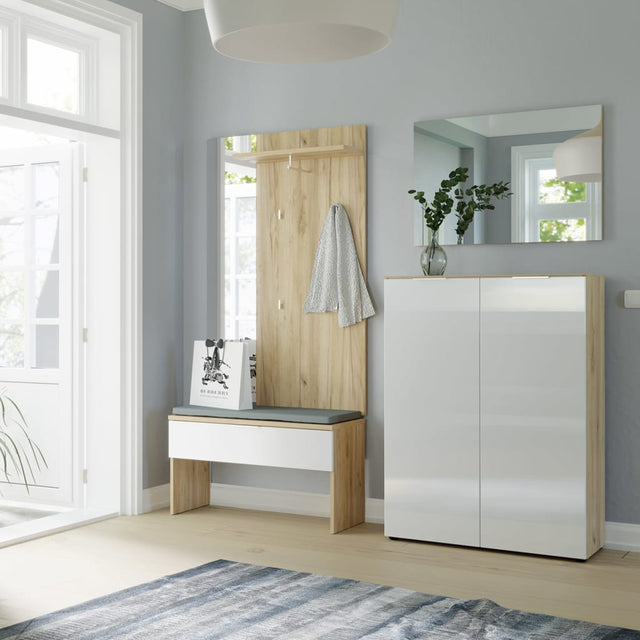 Het ontwerp in Navarra eikenfineer met glazen fronten in tijdloos wit geeft de GW-Avino schoenenbank van Germania een moderne uitstraling, waardoor hij perfect is voor in de gang.