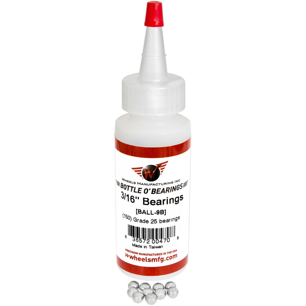 En flaske med 150 separate kulelager fra klasse 25, 3/16 ", egnet for mange merker av knutepunkter, baloser og markeder.