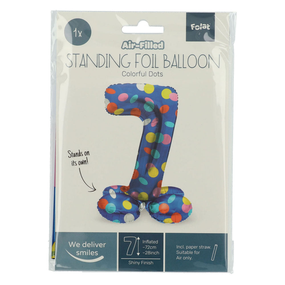 Denne stående folieballongen med nummer 7 er fargerik og utstyrt med muntre prikker. Ballongen har en størrelse på 72 cm. Det er et perfekt tilskudd for forskjellige festlige anledninger, for eksempel bursdager, barnefester og temafester. Denne folieballongen kan lett fylles med luft, ingen helium er nødvendig. Laget av slitesterkt folie materiale.