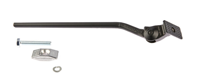 This application is designed with a center stand and a compression spring mechanism. It has been tested on cobblestones and is made of cast aluminum GD-AlSi9Cu3. The package includes a bolt and washer. A mounting plate and a stand shoe are optionally available. This product is made of aluminum with a hardened steel pin. The bolt has an M10x20 dimension, and an F6 washer is also included.