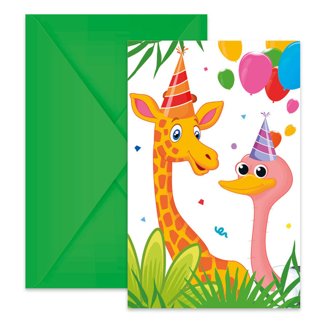 This set of 6 invitations is perfect for a children's party with a jungle animal and balloon theme. The invitations feature a cheerful print and come with jungle green envelopes. They are made from FSC-certified paper, meaning they are environmentally friendly.