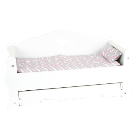 Cama de boneca de madeira pequena com gaveta e roupa de cama, 4dlg.