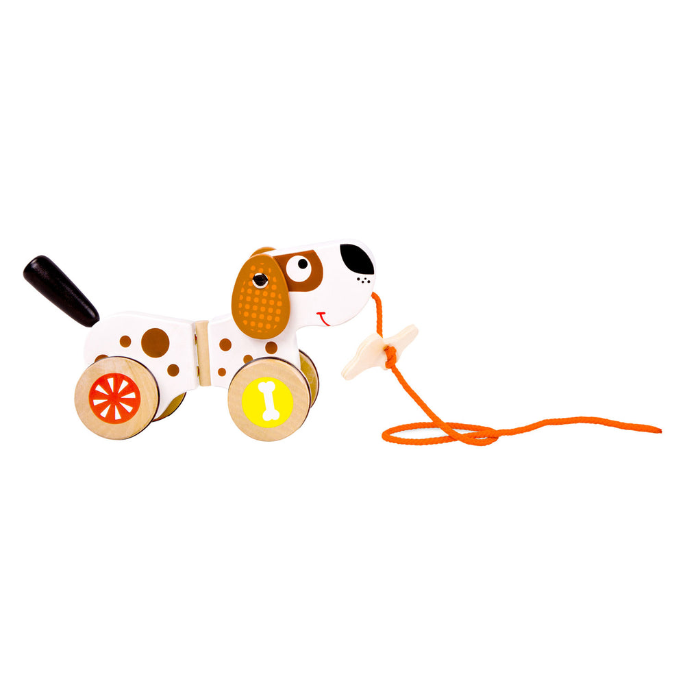 Um cachorro fofo que crianças pequenas podem puxar para trás. O cachorro tem rodas com anéis de borracha para reduzir o som. Ele abana os ouvidos e a cauda e fica bem em todas as curvas. Um osso de recompensa em uma corda torna o jogo ainda mais divertido.